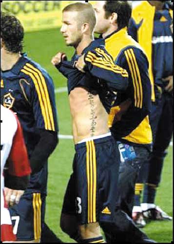 小貝的新文身位于身體左側,從胸部延伸到腹部。據英國媒體披露,貝克漢姆的文身是他數年前就聽說過的一個中國諺語,他早就想將這段文字刺在身體上。根據英國媒體的介紹,這段文字應該是:“生死有命,富貴由天!比欢,小貝身上的字卻有所出入。
