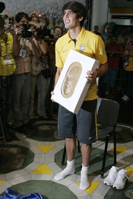 昨日,正隨巴西國家隊備戰(zhàn)世界杯預(yù)選賽的卡卡抽空在著名的里約熱內(nèi)盧馬拉卡納足球場參加一個名人紀(jì)念館活動。在那里,前世界足球先生和金球獎得主卡卡留下了自己的“足跡”,米蘭頭號球星正式成為馬拉卡納足球場名人堂的成員,也是第94位進(jìn)入這一名人堂的足球名人。