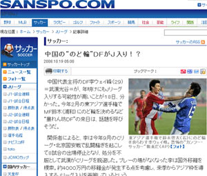 李瑋鋒即將加盟日本J聯(lián)賽的消息最早見諸于17日的日本雅虎體育。當(dāng)時(shí),雅虎體育就以“功夫足球?qū)⒌顷懭毡?”為題,曝出了中國國家隊(duì)主力李瑋鋒即有可能在明年初加盟J聯(lián)賽,并稱李瑋鋒“作為最強(qiáng)最兇悍的后衛(wèi),堪稱中國功夫足球的代名詞”。19日,日本產(chǎn)經(jīng)體育等多家媒體進(jìn)一步證實(shí)了這一消息,并稱“動(dòng)粗小子”李瑋鋒的到來不 啻為一場(chǎng)“恐怖襲擊”。