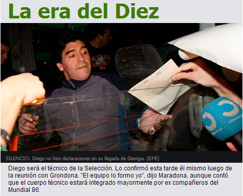 《奧萊報(bào)》以“10號(hào)的時(shí)代”為標(biāo)題,第一時(shí)間發(fā)表了這條消息。阿根廷時(shí)間10月28日下午,馬拉多納在和格隆多納面談后確定了自己將成為新的國(guó)家隊(duì)主教練。他說(shuō):“我將自己組建球隊(duì)!蓖瑫r(shí)他還表示,教練組將以他86年世界杯奪冠時(shí)的球隊(duì)成員為主,甚至當(dāng)時(shí)的冠軍主帥比拉爾多也有可能再度出山,輔佐愛(ài)徒。