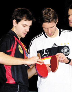 波爾和弗雷德里希在研究球拍膠皮。