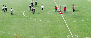 15日上午,在一所校園操場上,記者見識了一場別具一格的中置足球比賽。只見10多名運動員在外圍直徑30多米的圓圈內(nèi),圍著滾動的足球時而防守,時而狂奔發(fā)起進(jìn)攻,一名隊員帶球快跑犯規(guī),裁判員立即吹響口哨,另一隊員發(fā)了一記角球,將球踢向中場,掀起激烈的爭奪。守門員得球后,轉(zhuǎn)身一拋,球即進(jìn)入對方防區(qū),激烈戰(zhàn)火再次燃起……在10多分鐘的比賽中,雙方分別進(jìn)球5個和6個,比賽結(jié)束時,隊員們和觀眾都還意猶未盡。徐大從告訴記者,中置足球進(jìn)攻時出界球少,活動的連續(xù)性好,有效對抗的機(jī)會多,這就使得體能較差的學(xué)生也能夠享受到足球運動的快樂。