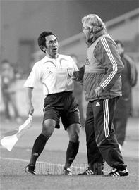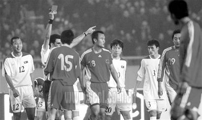 不僅如此,在國(guó)足第一個(gè)任意球射門出線之后,伊朗主裁以朝鮮隊(duì)金永俊提前移動(dòng)為由,不但給金永俊出示了黃牌,還判任意球重罰。國(guó)足第二次也沒打進(jìn),此時(shí)主裁卻判再次重罰!這次的理由居然是杜震宇罰球時(shí),主裁還沒鳴哨,為此,杜震宇又吃了黃牌,第三次罰球,曲波抽射偏出。如此一波三折的任意球,使得現(xiàn)場(chǎng)球迷也覺得搞笑,一位球迷說:“這個(gè)球不但吹得蹊蹺,而且罰了三次真是好!
