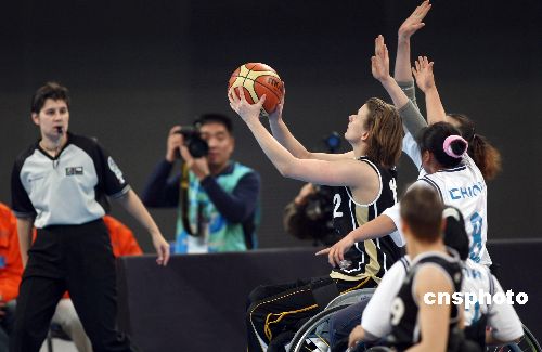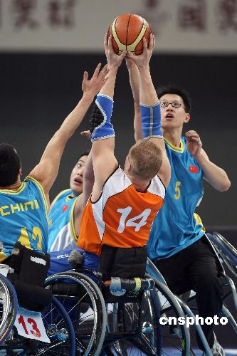 國(guó)際輪椅籃球邀請(qǐng)賽中國(guó)男隊(duì)無(wú)力阻擋荷蘭男隊(duì)進(jìn)攻。