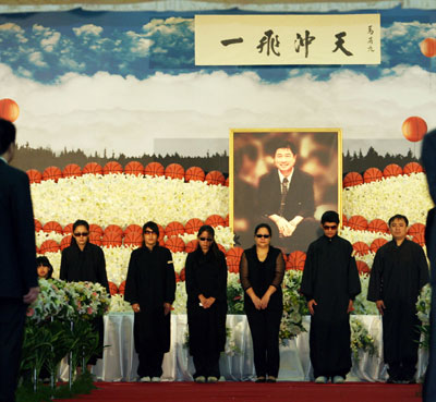 據臺灣媒體報道,錢一飛的靈堂由三百顆籃球布置而成,正中央懸掛國民黨參選人馬英九所題的“一飛沖天”挽聯(lián),充分顯示出錢一飛在戰(zhàn)場上拼戰(zhàn)不懈、戰(zhàn)績彪炳和一生精彩的籃球精神。