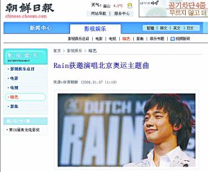 據(jù)前日的《朝鮮日報》報道稱,韓國藝人Rain(鄭智熏)獲邀演唱北京奧運主題曲。朝鮮日報報道稱:“據(jù)悉,北京奧委會2007年曾向Rain發(fā)出邀請,希望他能夠演唱奧運主題曲!璕ain欣然接受了邀請,目前正在與北京奧委會(注:應為北京奧組委)方面談具體事宜。”