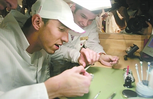 8月18日,菲爾普斯與世界最頂級(jí)的游泳運(yùn)動(dòng)員共同在朝陽(yáng)公園的草地上吃午餐,陽(yáng)光刺眼,他卻獨(dú)自躺在躺椅上享受日光浴。休息片刻,他站起身,漫不經(jīng)心地拿起一罐可樂(lè),一仰脖喝了下去,隨后,大口吃著肉串,不時(shí)和旁邊的姑娘們說(shuō)笑著,而近在咫尺就是黑壓壓的一片鏡頭群,“Michael……Michael”此起彼伏的喊聲中,他扭過(guò)頭來(lái)笑笑,端著盤子走近圍欄邊。面對(duì)“圍困”的場(chǎng)面,菲爾普斯似乎并沒(méi)有太多不適,也不曾“黑面”,總是隨心所欲地嬉鬧。休息時(shí),大腳趾吊著涼拖,繞啊繞的,很悠閑。
