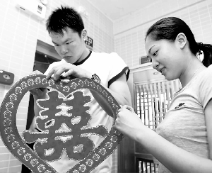 朱芳雨和胡美忙著弄紅雙喜,布置他們的新房。
