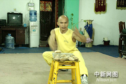 走進廣東高明區(qū)揚龍武館,吸引記者眼光的不是吊著的練功沙包和十八般武器,而堆在武館角落里的一大堆鵝卵石、椰子和堆碼得十分整齊的紅磚似乎暗藏玄機。
