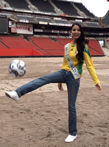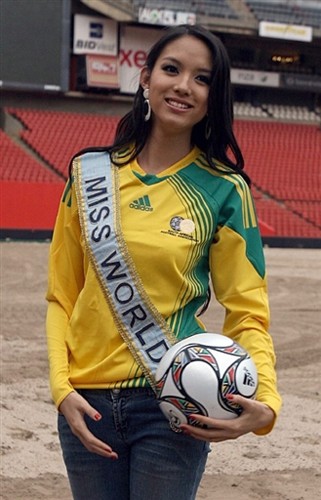 中新網(wǎng)11月21日電 當?shù)貢r間22日,2009年聯(lián)合會杯抽簽儀式將在南非城市約翰內(nèi)斯堡舉行。包括世界小姐張梓琳在內(nèi)的各國佳麗應(yīng)邀前往,在約翰內(nèi)斯堡的埃利斯球場大秀球技。