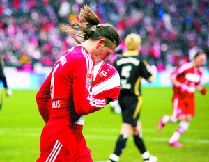 最先掀起“愛情風暴”的是當下狀態(tài)大勇的法國球星里貝里,他本場特意穿上粉紅球鞋戴上紅色手套,活脫脫一個紅色小精靈。第29分鐘他的任意球直接破門,為球隊很快扳平了比分。這也是里貝里連續(xù)第6場聯(lián)賽進球,激動的他在進球后特別親吻了寫有妻子瓦希芭(Wahiba)名字的左手腕繃帶。半場結束前,中衛(wèi)德米凱利斯收獲進球。阿根廷人進球后令人意外地撿起球?qū)⑺M球衣里,做出孕婦的姿勢。原來這一幕是獻給他已經(jīng)懷孕的女友伊萬格利娜的。下半場,拜仁的進球風暴并未停歇,而表達愛意的慶祝動作也似乎可以傳染?寺鍧蓪⒗镓惱锏膫髦星蝽斎牒,伸出三根手指,指代妻子希爾維婭和雙胞胎兒子。此后托尼和奧多配合后破門,意大利人也特別親吻著左手,原來大拇指上戴有未婚妻瑪塔送他的戒指。