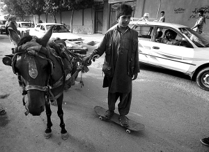 六個(gè)孩子在街頭公園里玩滑板,翻著跟頭,不停地笑著,看起來和世界任何一個(gè)城市的孩子一樣,但這里是喀布爾,阿富汗。就在離他們二十幾米以外,有輛被炸毀的汽車還躺在一攤刺眼的血跡旁,一個(gè)多小時(shí)前,這里剛剛發(fā)生了一起汽車炸彈爆炸事件。