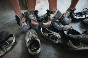 最讓大伙頭疼的還是球鞋。瓊中雨水多,球鞋很容易壞,有時(shí)兩個(gè)星期就能穿壞一雙。一開(kāi)始谷教練還把隊(duì)員的鞋拿出去補(bǔ),后來(lái)為了省錢(qián)索性買(mǎi)回工具和線讓姑娘們自己補(bǔ)。
