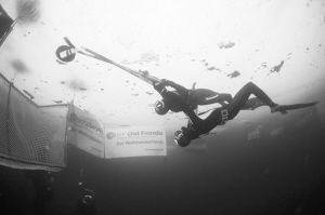 2004年冬天,兩人又來到韋森湖潛水。平時(shí),兩人也會在冰面上打打冰球。突然,雷德爾有個新念頭:能不能到水中打呢?第2年,雷德爾找來平時(shí)一起玩戶外潛水的德國、斯洛伐克等地的朋友,一起搞了一場小型比賽。他們的冒險(xiǎn)行動很快就引起了商家的關(guān)注,很多老板主動找上門。雷德爾等人就在2006年推出了水下冰球世界杯。