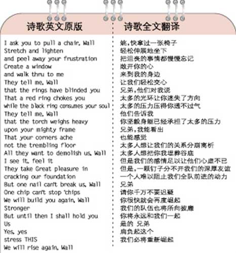 盡管這首詩是不是麥蒂親筆所寫,目前還沒有得到最終的確認(rèn)。但詩中的這種濃濃的兄弟之情,正是火箭隊全隊目前所需要的。在沒有姚明的情況下,火箭隊只有團結(jié)一心,努力奮斗,才能向著球隊的目標(biāo)一步步邁進。