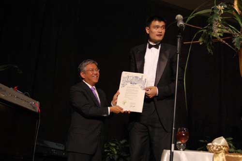在晚宴中間,休斯頓市長比爾-懷特的代表、前市議員關振鵬講話宣布,比爾-懷特市長頒發(fā)特別文告,命名4月17日為姚明日(Yao Ming’s Day)。