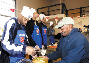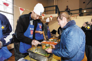 昨天,易建聯(lián)(左圖左一)和卡特、哈里斯等籃網(wǎng)隊(duì)員一起來(lái)到新澤西的一家教堂,在感恩節(jié)到來(lái)之際,向當(dāng)?shù)厣鐓^(qū)貧困居民分發(fā)食品。在活動(dòng)現(xiàn)場(chǎng),易建聯(lián)身著便裝頭戴一頂繡有籃網(wǎng)標(biāo)志的廚師帽發(fā)放食物,整個(gè)活動(dòng)過程中易建聯(lián)始終面帶微笑,并和獲贈(zèng)食物的居民親切交談。
