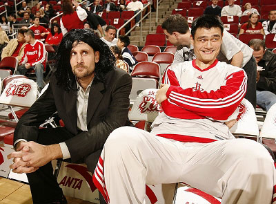 “斯科拉”一身黑西裝坐在姚明的身旁,旁邊的姚明捧腹大笑,嘴中還念念有詞。不,出了個(gè)小差錯(cuò),姚明身邊的人不是斯科拉,而是布倫特·巴里,他正戴著火箭為主場(chǎng)球迷們準(zhǔn)備的斯科拉超酷假發(fā)頭套。賽前,前2000名來到豐田中心的球迷都會(huì)獲得斯科拉的假發(fā)頭套,坐在第一排的球迷和工作人員均戴上了假發(fā)套。這次斯科拉的假發(fā)頭套不僅讓球迷得到愉悅,就連姚明也笑得直不起腰來。