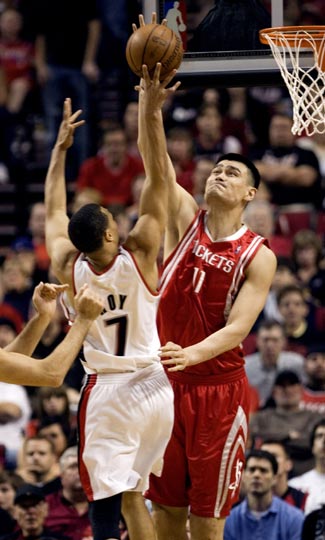 中新網(wǎng)4月19日電 北京時(shí)間4月19日,火箭旗開得勝,在季后賽首輪的第一場(chǎng)比賽中客場(chǎng)以108-81輕取開拓者。姚明在短短24分鐘內(nèi)9投9中得到24分9個(gè)籃板2次蓋帽。