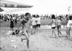 在網(wǎng)絡上,一張名為“火箭勝湖人,深圳球迷被迫裸奔”的貼圖瘋傳。發(fā)帖者稱,此深圳球迷王×,乃湖人當家球星科比的粉絲,之前在網(wǎng)上揚言火箭勝湖人他就裸奔,不幸言中,被網(wǎng)友們人肉搜索,要求他兌現(xiàn)承諾。發(fā)帖者甚至稱要求王×裸奔的還有其女友,因女友乃不折不扣的火箭球迷。王×在重重壓力之下遂面對現(xiàn)實,兌現(xiàn)承諾。于是5月5日下午的大梅沙海濱沙灘上,出現(xiàn)這樣一幕場景:一名男子脖套花內褲,手捂下體,向大海奔去,臉帶幾分笑意,幾分羞澀。