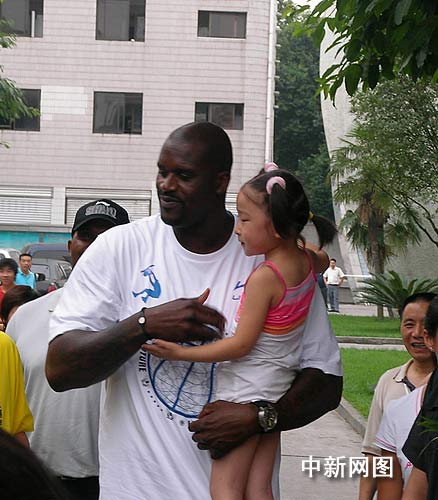 奧尼爾一下車,就受到孩子們的擁戴,現(xiàn)場一片歡呼聲和歡迎聲。已經(jīng)有了三個孩子的奧尼爾,興奮地抱起給他獻(xiàn)花的一位七歲小女孩,親了親她的臉頰。在人們的簇?fù)硐,奧尼爾參觀了汶川地震發(fā)生后修建的板房以及新校舍,詳細(xì)了解災(zāi)后孩子們的學(xué)習(xí)生活狀況。