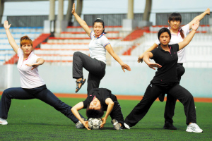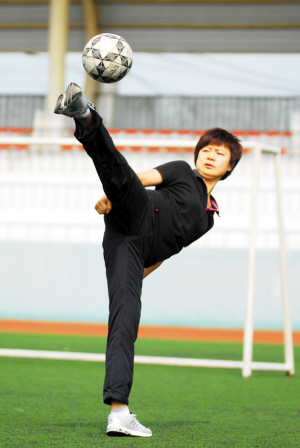 董靜拿了個足球在場上顛,基本上只能顛三四個。立在體育館門前的武術(shù)班教練簡介上寫著,董靜曾獲得過河北散打錦標(biāo)賽65公斤級冠軍,但讓她參加散打比賽行,讓她控制好這個小小的皮球,卻不容易。美女功夫足球隊名聲在外,真要踢起比賽來,不堪一擊。她們和當(dāng)?shù)貓F(tuán)委及一家外企的男隊進(jìn)行過兩場較量,結(jié)果慘不忍睹。