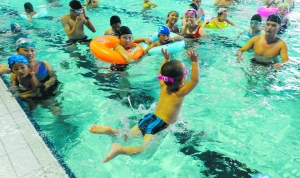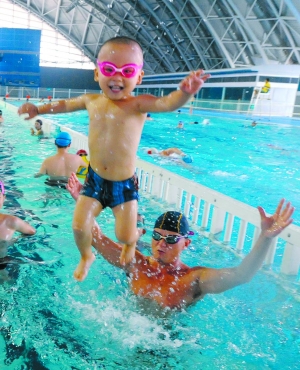 伸伸腿,彎彎腰,一番準備后,小劉暢迫不及待地跑到泳池邊,父親劉先生抱起兒子,撲通一聲丟下水,接著又一把撈了起來。記者嚇了一跳,耳邊卻傳來小家伙“咯咯”的笑聲!拔医o他試試水,適應一下!眲⑾壬忉,劉暢不怕水,對水有一種天生的親切感,這種夸張的“試水”方式,不會嚇到他,反而讓他感覺很“爽”。