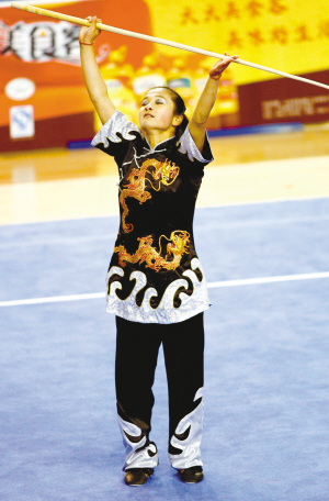 昨天上午,在濱州奧體公園體育館舉行的女子棍術(shù)比賽,代表重慶參賽的17歲小將袁夢潔一出場就吸引了觀眾的目光,“這套服裝不錯,挺好看的!”袁夢潔穿的一件鑲有亮片的金色服裝,中間腰帶緊收,下裝則是黑褲但在腳邊又有金色的花型,在整個體育場燈光的照耀下,特別搶眼。