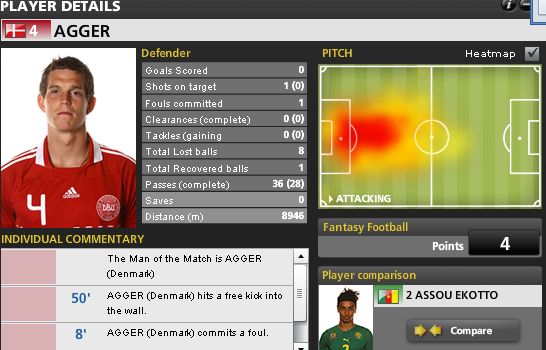第6分鐘,阿格成功防守,喀麥隆隊前鋒韋博突破后進攻被破壞而惱羞成怒,對其犯規(guī)。第20分鐘,喀麥隆隊中場大將恩瑪納禁區(qū)前沿拿球突破,沒有能夠突破阿格的防守。40分鐘時,喀麥隆隊前場反擊,不過他們的直傳球被阿格成功攔截。下半場第7分鐘,埃托奧前場傳球恩瑪納,后者禁區(qū)前一帶想尋求突破,不過阿格的貼身防守非常成功,球被破壞出了邊線。下半場第14分鐘,喀麥隆隊后場搶斷發(fā)動反擊,埃托奧禁區(qū)內(nèi)帶球摔倒了,不過主裁判并沒有吹罰丹麥隊球員犯規(guī),因為阿格的防守非常干凈。1分鐘后,阿格倒地鏟球,將埃托奧的帶球斷下,化解了門前險情。