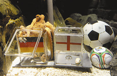 這只名為保羅的兩歲大章魚恰巧生于英國,在德國長大。海洋館員把分別印有德、英旗幟的貝殼放入玻璃缸,結(jié)果保羅只取出德國那枚貝殼。保羅之前也曾“估中”德國勝澳洲、加納與輸給塞爾維亞的賽果,德國隊在上屆歐國杯的賽事,其預(yù)測命中率也有8成。