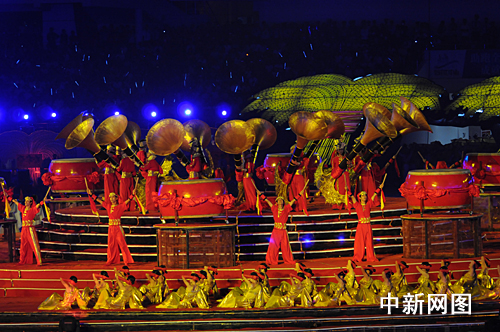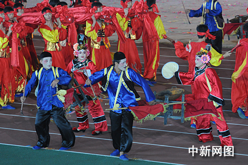 在運(yùn)動員入場式后,以“歡樂農(nóng)運(yùn)•親情海峽•和諧中華”為主題的大型文體表演《大地情飛揚(yáng)》正式開始。整臺節(jié)目具有濃郁的閩南地域文化特色,為觀眾獻(xiàn)上了一道氣勢磅礴的視覺大餐。