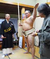 下午4點(diǎn)半過(guò)后,來(lái)到工作室的朝青龍笑著說(shuō):“這是第一次,所以很緊張。我會(huì)努力的!背帻埾瞪习咨鄵溲鼛В沂殖謱毎,左手抬起,擺出憤怒的表情,拍下了照片。