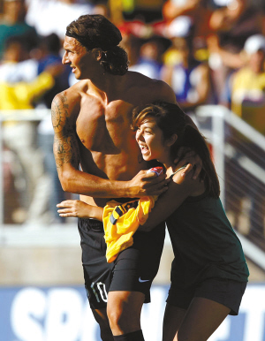 美國國際足球挑戰(zhàn)賽,一名亞裔美少女球迷沖進(jìn)場內(nèi)熊抱伊布,反倒讓國米球星面露尷尬。前天,墨西哥美洲隊(duì)在點(diǎn)球大戰(zhàn)中以5比4戰(zhàn)勝國米。伊布下半時(shí)替補(bǔ)上場后顯得毫無斗志,賽后馬上脫下了國米特制的百年紀(jì)念版藍(lán)黑戰(zhàn)袍。西班牙媒體報(bào)道,最快在本周五,伊布將穿上巴塞羅那球衣。