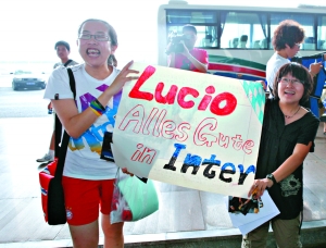 現(xiàn)場還有兩位女球迷顯得非常安靜,她們手上的自制海報寫著“Lucio Alles Gute in Inter(盧西奧,在國米一切順利)”,還高舉著拜仁的球衣,當盧西奧現(xiàn)身時,其中一位女球迷狂叫著“盧西奧”的名字,飛奔至國米大巴邊,被兩位保安攔下。