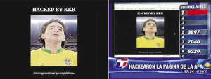 當(dāng)?shù)貢r(shí)間周五,阿根廷TN電視臺(tái)報(bào)道了一起網(wǎng)絡(luò)襲擊事件,一名自稱為“KKR”的黑客襲擊了阿根廷足協(xié)官方網(wǎng)站(.ar),在阿根廷足協(xié)官網(wǎng)上放上了一張馬拉多納身穿巴西國(guó)家隊(duì)球衣的照片。
