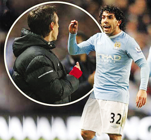 昨天,英格蘭聯(lián)賽杯半決賽首回合進行了一場曼徹斯特同城德比,結(jié)果曼城在第17分鐘就先被對方隊長吉格斯率先破門的不利形勢下,憑借前曼聯(lián)舊將、阿根廷國腳前鋒特維斯在第40分鐘的點球、第65分鐘的頭球,最終在主場以2:1險勝曼聯(lián)。值得關(guān)注的是,綽號“野獸”的特維斯此番面對“拋棄”他的老東家紅魔曼聯(lián)首度進球,而且還是梅開二度。不過,反咬紅魔快意復(fù)仇的“野獸”在進球后帶有挑釁、示威意味的張狂慶祝動作,卻引發(fā)了一場鬧劇。