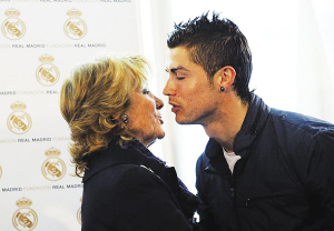北京時間昨天是C羅的生日,他和皇馬主席弗洛倫蒂諾一起在伯納烏參加了一項新聞發(fā)布會;蜀R俱樂部與馬德里大區(qū)達成了合作協(xié)議,皇馬基金會將會投資幫助馬德里大區(qū)那些未成年人、外國移民等等。在新聞發(fā)布會現(xiàn)場,C羅和弗洛倫蒂諾開起了玩笑;蜀R主席問C羅“你現(xiàn)在多大了”,C羅回答“我20歲了”。弗洛倫蒂諾當即揭穿了C羅的謊言:“你已經(jīng)25歲了,你竟然已經(jīng)這么老了!”當然,這次玩笑以全場歡笑告終!∽鳛榛蜀R代表,C羅還與馬德里大區(qū)女主席阿吉雷進行了親密接觸。盡管阿吉雷的年齡足以當C羅的奶奶,但葡萄牙人還是跟她來了一個貼面熱吻。在被C羅熱吻之后,阿吉雷顯得非常高興,立刻說:“C羅是世界上最出色的球員,沒有之一!蓖瑫r阿吉雷也宣稱,“皇馬是歷史上最出色的足球俱樂部。”