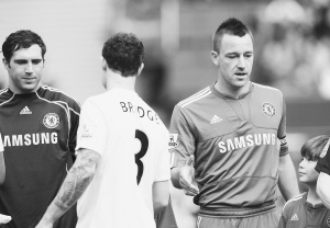 看臺上雙方球迷打出了支持各自球員的橫幅,與“特里之隊”相對的是“布里奇之隊”。開場后,布里奇和特里有過一次直接面對面的機會。特里在大禁區(qū)左側(cè)拿球,布里奇在防守他,雙方并沒有糾纏太久,特里草草射了一腳門了事。