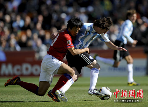 中新網(wǎng)6月17日電 北京時(shí)間今晚19點(diǎn)30分,2010年南非世界杯B組第二輪的首場(chǎng)比賽打響,由兩屆世界杯冠軍得主阿根廷隊(duì)迎戰(zhàn)亞洲“太極虎”韓國(guó)隊(duì)。16分鐘韓國(guó)隊(duì)前鋒樸周永不慎打入本屆世界杯的第二記烏龍;33分鐘阿根廷再獲得定位球,伊瓜因門(mén)前頭槌建功,2-0;上半場(chǎng)補(bǔ)時(shí)階段韓國(guó)隊(duì)由李青龍扳回1球,但下半場(chǎng)伊瓜因連入2球,上演本屆世界杯的第一個(gè)帽子戲法,助阿根廷4-1鎖定勝局,提前小組出線(xiàn)。
