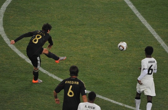 德國(guó)隊(duì)的控球時(shí)間高于對(duì)手,但是前鋒的把握機(jī)會(huì)能力差強(qiáng)人意。16分鐘,波多爾斯基抽射打空。加納隊(duì)的控球能力也很強(qiáng),隊(duì)員們技術(shù)比較出色,反擊十分犀利。第25分鐘,德國(guó)隊(duì)獲得了開(kāi)場(chǎng)以來(lái)最好的機(jī)會(huì),厄齊爾拿球后單刀直入,但是面對(duì)對(duì)方門(mén)將金森,竟然將球射到對(duì)方身上,皮球被擋出。加納隊(duì)隨后也發(fā)動(dòng)進(jìn)攻,阿尤角球開(kāi)到前點(diǎn),吉安高高躍起頭球攻門(mén),門(mén)將撲救不及,但幸好門(mén)前的拉姆護(hù)門(mén)成功,在球門(mén)線上用身體將球擋出。