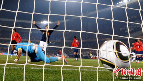 智利隊(duì)的進(jìn)攻,也讓他們付出了比較慘重的代價(jià)。從15分鐘到21分鐘的短短6分鐘內(nèi),裁判竟然向他們出示了三張黃牌,得牌者分別為梅德爾,龐茨,埃斯特拉達(dá)。智利隊(duì)的大舉進(jìn)攻,也讓他們的后防線空虛,第24分鐘,西班牙隊(duì)前鋒托雷斯左路帶球突破,智利隊(duì)門將布拉沃貿(mào)然出擊,將球斷下但擊打到中場(chǎng),球到了比利亞腳下,后者沒有調(diào)整直接起腳吊射空門,1比0,西班牙隊(duì)領(lǐng)先!這也是比利亞本屆世界杯的第三個(gè)進(jìn)球。