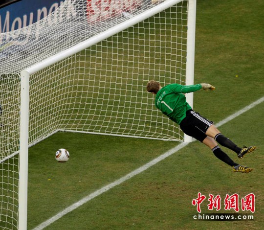 上半場(chǎng)第20分鐘,德國(guó)隊(duì)門(mén)將諾伊爾開(kāi)出球門(mén)球直接打到前場(chǎng),克洛澤在禁區(qū)內(nèi)擠開(kāi)厄普森,搶在詹姆斯之前倒地捅射破門(mén),率先打破僵局,德國(guó)隊(duì)1-0領(lǐng)先英格蘭。隨后英格蘭開(kāi)始組織反擊,不過(guò)他們的遠(yuǎn)射缺乏威脅。第30分鐘,克洛澤接隊(duì)友的傳球形成單刀,后者的推射打在表現(xiàn)不錯(cuò)的詹姆斯腿,無(wú)緣破門(mén)。