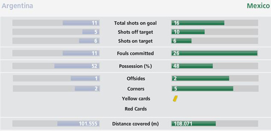 本場比賽,墨西哥隊(duì)射門16次,遠(yuǎn)多于阿根廷隊(duì)的11次,兩隊(duì)各有6次射門擊中門框范圍之內(nèi)。墨西哥隊(duì)獲得的角球也多于阿根廷隊(duì),他們得到了5個,而阿根廷只有2個角球。