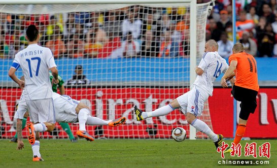 中新網(wǎng)6月28日電 今晚22:00,南非世界杯1/8決賽第五場(chǎng)比賽在德班球場(chǎng)拉開戰(zhàn)幕,由E組頭名荷蘭隊(duì)迎戰(zhàn)F2第二名斯洛伐克。憑借羅本和斯內(nèi)德在上下半場(chǎng)的進(jìn)球,荷蘭隊(duì)以2-1淘汰斯洛伐克。補(bǔ)時(shí)階段,維泰克為斯洛伐克隊(duì)攻入一粒安慰性的點(diǎn)球。