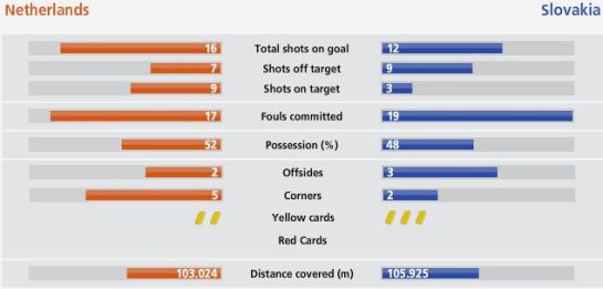 控球方面,荷蘭隊在領(lǐng)先后有所放松,但仍以52%的控球率領(lǐng)先于對手的48%。荷蘭隊在比賽中獲得了5個角球,斯洛伐克獲得了2個。斯洛伐克在補(bǔ)時的最后階段獲得了全場唯一的一個點(diǎn)球,維特克主罰命中。荷蘭隊有2次越位,斯洛伐克為3次。
