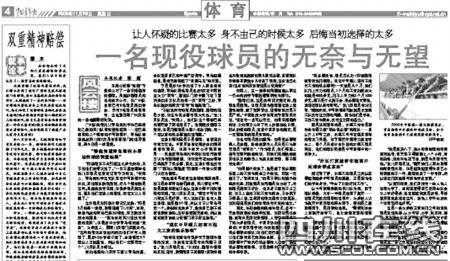 今年9月2日進(jìn)行的中甲聯(lián)賽中,四川隊(duì)坐鎮(zhèn)主場(chǎng)四川大學(xué)體育場(chǎng)對(duì)陣青島海利豐,客場(chǎng)作戰(zhàn)的海利豐3球領(lǐng)先,但該隊(duì)隊(duì)員卻在最后時(shí)刻連續(xù)三次吊射本方球門,不得不讓人懷疑有人在操控比賽。中青報(bào)這篇《一名現(xiàn)役球員的無奈與無望》的報(bào)道就從這場(chǎng)比賽切入正題,報(bào)道中稱,一名不愿意透露姓名的川足隊(duì)員說,“我也想盡早知道這場(chǎng)球的調(diào)查結(jié)果,我不是希望青島被罰降級(jí)或四川留在中甲,我是真想知道能不能從這場(chǎng)比賽中找到假球的證據(jù)!