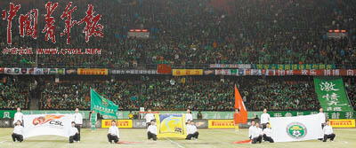 中國足協(xié)超級聯(lián)賽揭幕戰(zhàn)今晚在北京工人體育場舉行。北京國安隊以2∶0戰(zhàn)勝了南昌八一隊。賽場廣播提前兩個小時就開始循環(huán)播放“做文明觀眾、理智對待比賽輸贏”的宣傳口號,場內(nèi)為南昌八一隊挑戰(zhàn)衛(wèi)冕冠軍助威的近400名客隊球迷,在兩隊武警的保護下被隔離在球門后的看臺,周圍則是近5萬名狂熱的主隊球迷。