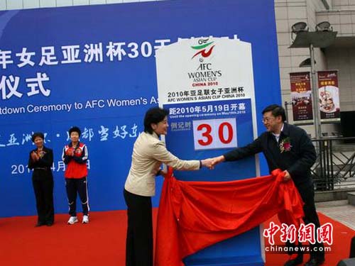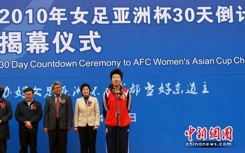 中新網(wǎng)成都4月20日電(記者 楊杰)20日下午,2010年女足亞洲杯30天倒計(jì)時(shí)揭幕儀式在成都舉行,中國(guó)足協(xié)副主席薛立、成都市副市長(zhǎng)傅勇林、中國(guó)女子足球隊(duì)教練陳金剛、中國(guó)女子足球隊(duì)隊(duì)長(zhǎng)畢妍,以及泰國(guó)駐成都總理事孫建功等出席了揭幕儀式。
