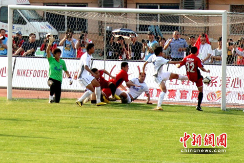 當天下午南昌氣溫高達30度,炙熱的太陽阻擋不了主場球迷的擂鼓吶喊。比賽一開始,雙方球員就展開激烈對攻。第10分鐘,泰達隊率先取得進球,王新欣在禁區(qū)線上左腳一射踢進球門,泰達隊1-0取得領(lǐng)先。