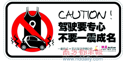 在剛剛結(jié)束的車展上,網(wǎng)易為推廣《亞運(yùn)文明公約》,特推出了一套以“孫悅車震事件”為主題的搞笑車貼向觀眾派發(fā)。車貼上寫著:駕駛要專心,不要一震成名,F(xiàn)場(chǎng)不少參觀者看到“孫悅車貼”后,都忍不住咧嘴偷笑。